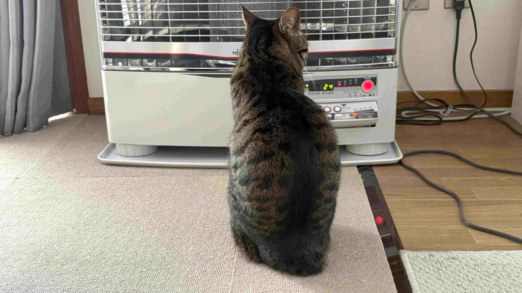 朝はまだ、少し寒いのか、ねこはストーブの前にいる